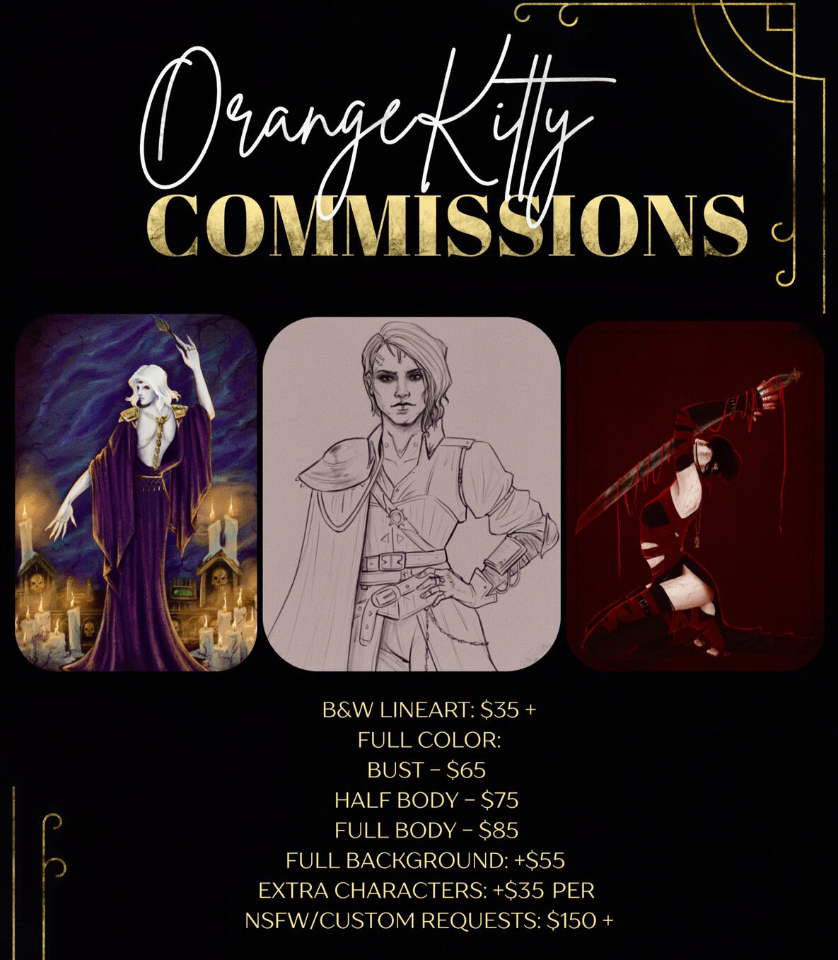 If you are requesting an original character, please include the following:- A basic overview of the character, personality, traits you would like to see included, or anything you would like to make sure I capture. Things like class, fighting style, favorite weapons, favorite color, if applicable, are great but not necessary.